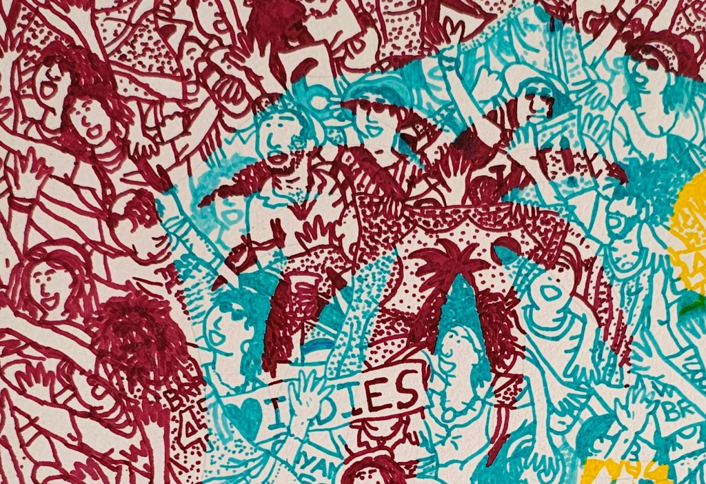 I draw using marker pen on card. I specialise in music and travel feature writing, and in 2009 I won a Guardian Media Award. In 2018 my poetry book, Across New Zealand in 140 Hitchhikes, was published by Paekakariki Press.